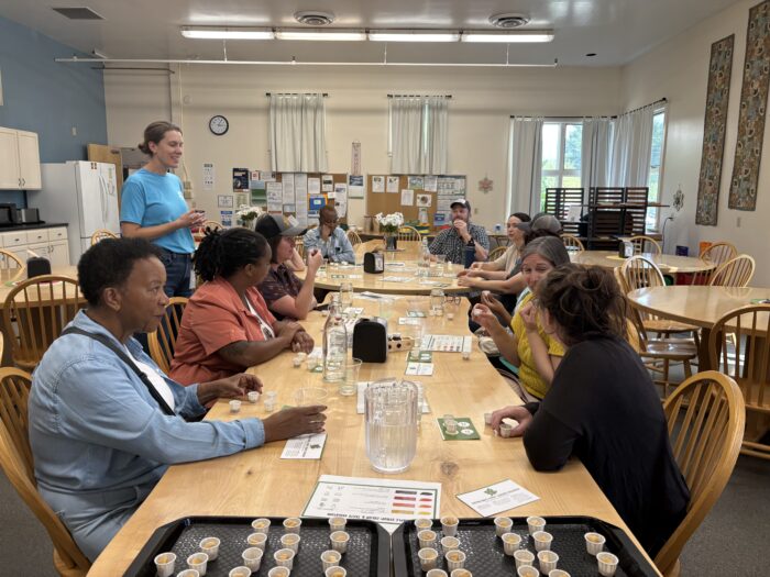 During our opening session, we were treated to a warm welcome to Vermont from NOFA-Vermont Executive Director Grace Oedel, who shared a brief history of what agriculture has looked like in the state since before European colonization, when the Abenaki people still controlled the land, and contextualized their present work in the state. She explained how the landscape has changed over Vermont’s history, from the push to clear land for sheep enterprises beginning with colonization, with booms and later consolidation in apples, then dairy, and then the maple sector. At the same time, she also emphasized the boom in diversified farms in the state beginning in the 1960s and 1970s, and how Vermont is still made up of many small, diversified farms. When the state experienced historic flooding several years in a row, these farms – many of which do not have access to crop insurance – were left with significant losses. In addition to the lack of workable crop insurance options for these farms, FEMA disaster aid also does not reach most Vermont farmers. As a result of the increasing risks of these kinds of disasters and their impact on farmers, NOFA-VT has undertaken a grassroots campaign to establish a state-funded Farm Security Fund to create a safety net for Vermont farmers. Grace also spoke to other successful organizing efforts to improve the state’s food system, lifting up the work of the Vermont-based farmworker organization Migrant Justice in establishing the Milk with Dignity Standards Council to improve labor standards in the dairy industry in the state.