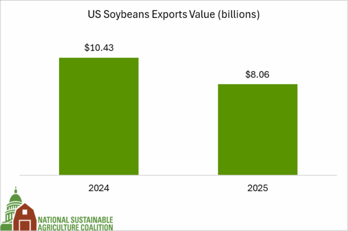 The US agricultural economy is heavily reliant on international markets. From livestock to grains, commodity production in the US has long exceeded domestic demand for the majority of major commodities. Because domestic demand is exceeded, the US agricultural economy relies on – and is exposed to – often volatile international markets. Sudden changes to trade rules and tariffs have made our usual buyers – like China and Argentina – nervous. Because they cannot reliably count on us, they are now buying from other countries instead. This has introduced significant uncertainty for farmers about markets and dropped crop prices – soybean sales are down 23% from the same time last year because of lower prices. While recently announced trade deals could shift this trend, legitimate uncertainties remain.