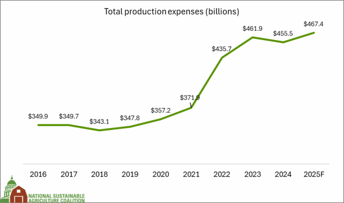 One of the most significant costs nearly all farmers face is for inputs – items produced off farm – that they deem necessary to their farm’s success. Some of the most common production costs include fertilizers, pesticides, and seeds. Determined in large part by global market conditions, fertilizer and pesticide prices are difficult, if not impossible to control with domestic policy, and recent turbulence in most global markets has only exacerbated the problem. In 2024, the cost to farmers of these combined crop inputs (chemicals, fertilizers, and seeds) rose by nearly $ 20 billion dollars (comparing 2024 to 2016). During that time period, pesticide production expenses jumped 42%, seed expenses jumped 26%, and fertilizer, lime, and soil conditioner expenses rose 44%. During that same time window, the amount of US acres in farms declined significantly, signalling that dramatic increases in production expenses are not being driven by expanded acreage.