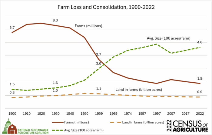 The National Sustainable Agriculture Coalition (NSAC) traces its earliest roots to the farm crisis of the 1980s, when cycles in the global economy and federal agricultural policy combined to push farmers losing their farms into the national spotlight. The 330,000 farm families who lost their farms between 1978 and 1992 were, unfortunately, not the last. The total number of farms has continued to steadily decrease since then, with the loss of mid-sized farms at a particularly concerning rate.
