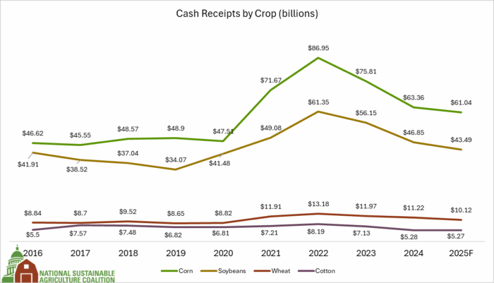 While production costs have risen significantly in recent years, nationwide, farmers are also facing low crop prices. Since the peak highs in 2021 and 2022, crop prices for corn, soybeans, wheat, and cotton have all fallen significantly – corn, soybeans, and wheat are all down more than 50% per bushel, while cotton is down more than 40%. On the back of these low prices, total crop cash receipts – including receipts from farm products like fruits and nuts – are forecast to decrease $ 6.1 billion (2.5 percent) in 2025. When focusing on some of the most prevalent row crops, we see that the combined cash receipts are even lower – corn, soybeans and wheat are forecast to fall by $ 6.8 billion in 2025.